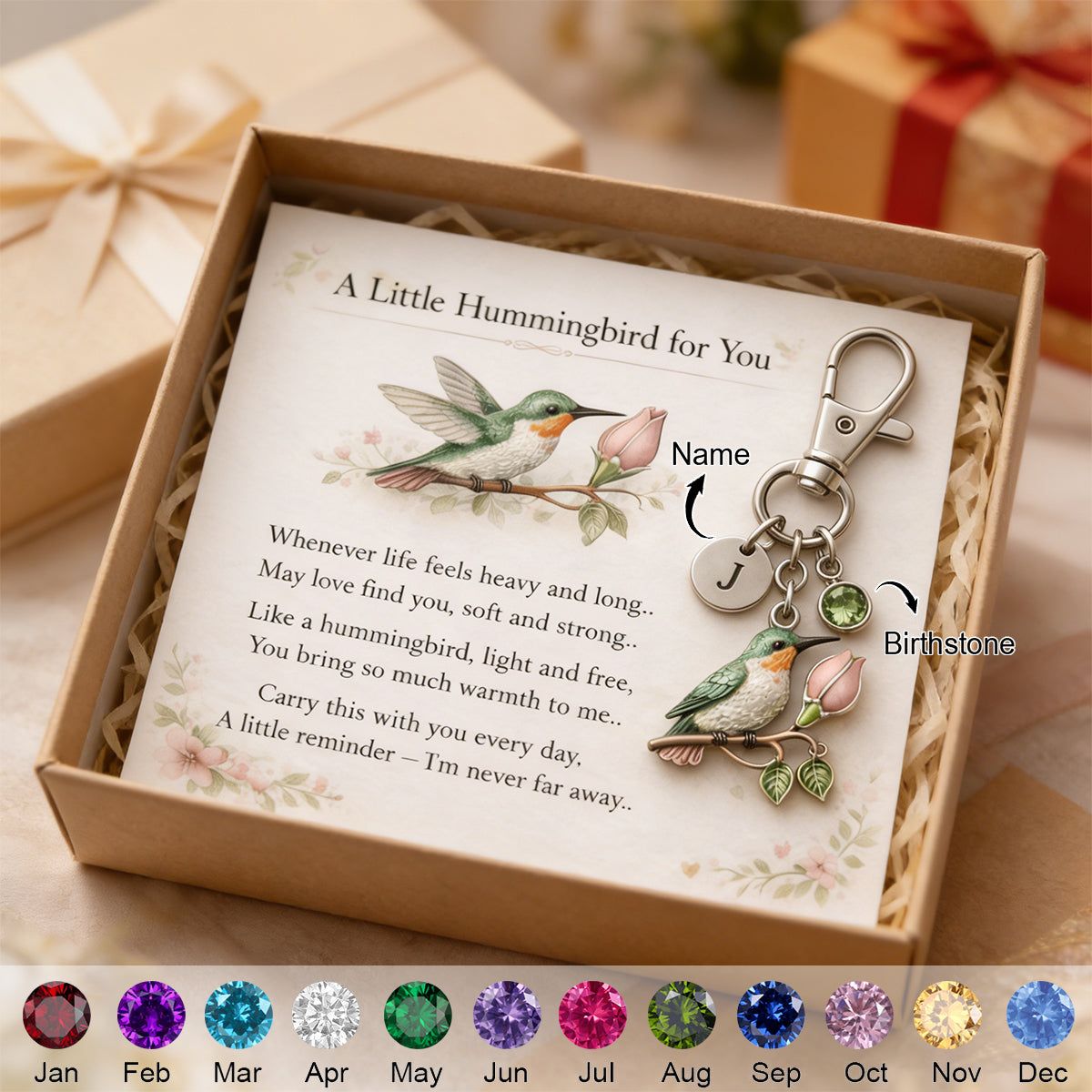 Tragen Sie mit unserem A Little Hummingbird for You Key chain ein kleines Stück Freude und Komfort, wohin Sie auch gehen. Dieses personal isierte Accessoire wurde sorgfältig als herzliches Geschenk zum Muttertag entworfen und ist voller Liebe, Wärme und sanfter Ermutigung. Passen Sie es mit einem Namen, einem besonderen Datum oder einer süßen Nachricht an, um es einzigartig zu machen, und lassen Sie sie wissen, dass sie jeden Tag geschätzt wird. Zart, bedeutungs voll und voller Zärtlichkeit ist es das perfekte kleine Andenken, um sie an Ihre Liebe zu erinnern und ihren Trost immer zu bringen.