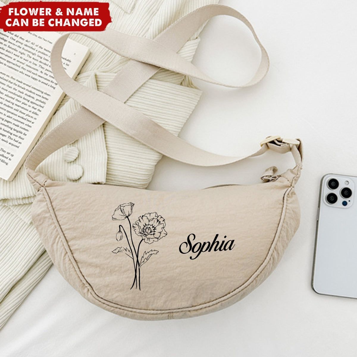 Rucksack mit Geburtsblume und Halbmond-Schultertasche, personalisierbar mit Handytasche