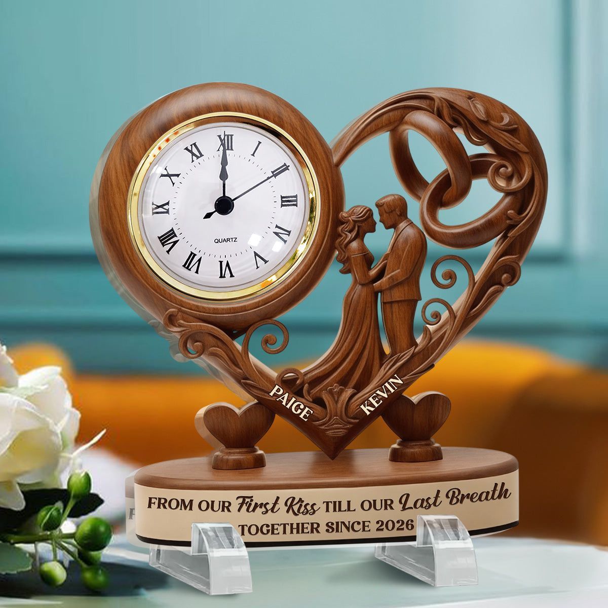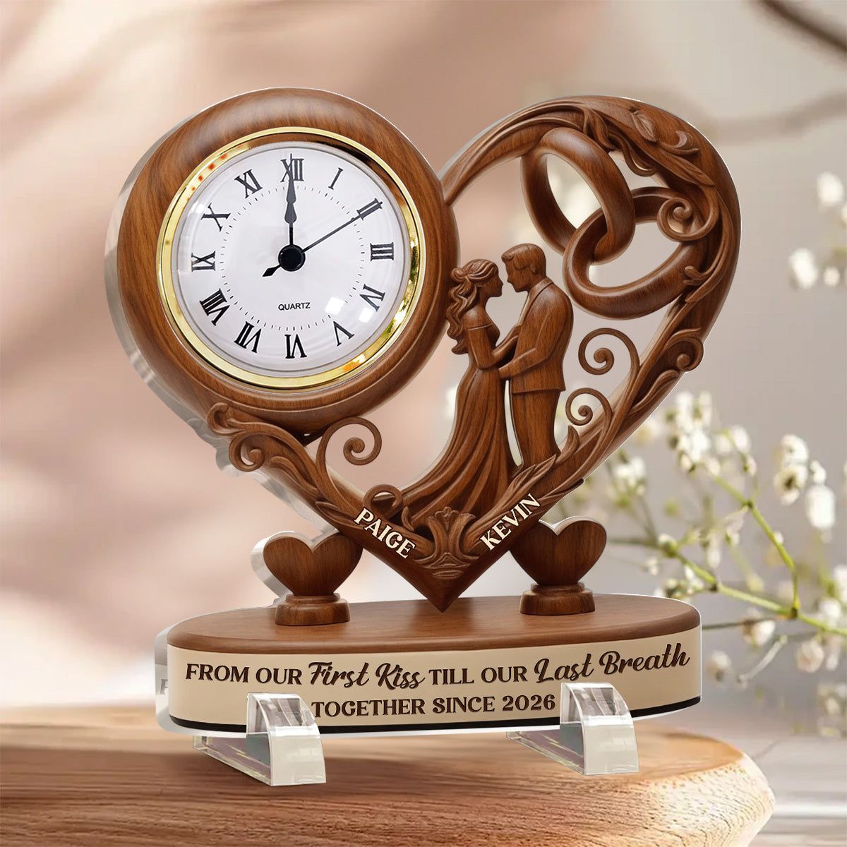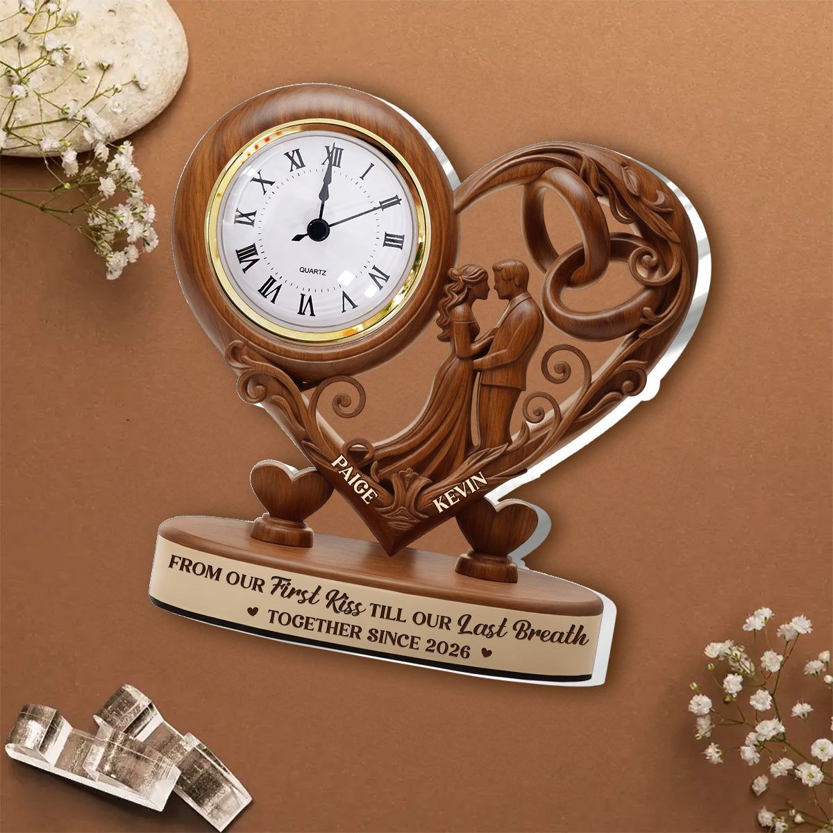Von unserem ersten Kuss bis zu unserem letzten Atemzug-personal isierter Acryl-Schreibtisch Clock personal isierte herzförmige Acryl-Schreibtisch uhr | Individuelles Hochzeits geschenk für Paare