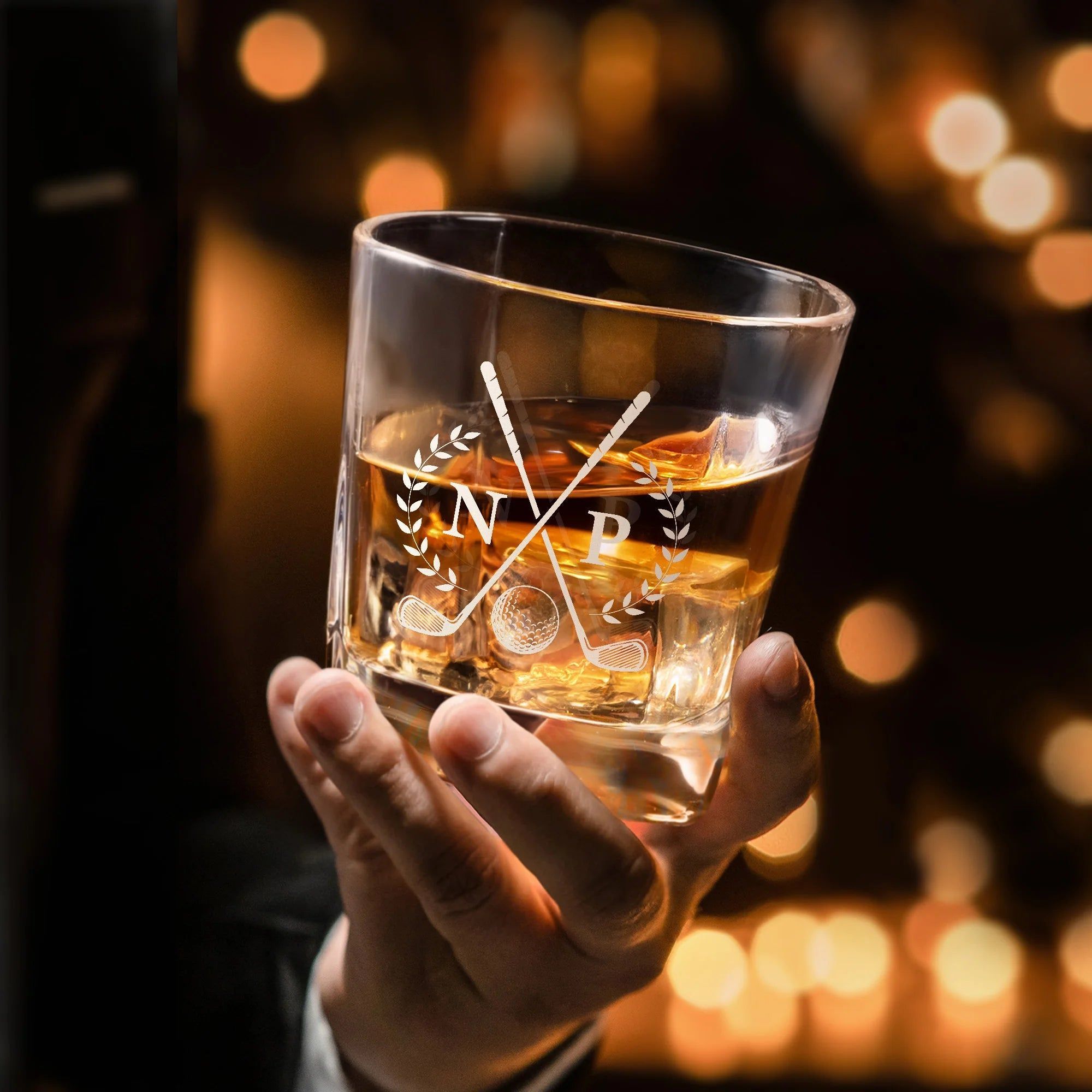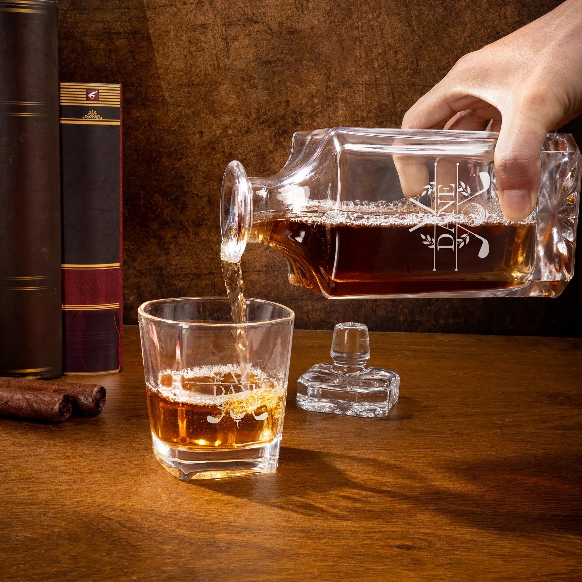Personalisiertes Whisky-Dekanter-Set aus Holz mit Namen und Initialen – ideales Geburtstags- und Spieltagsgeschenk für Golfliebhaber.