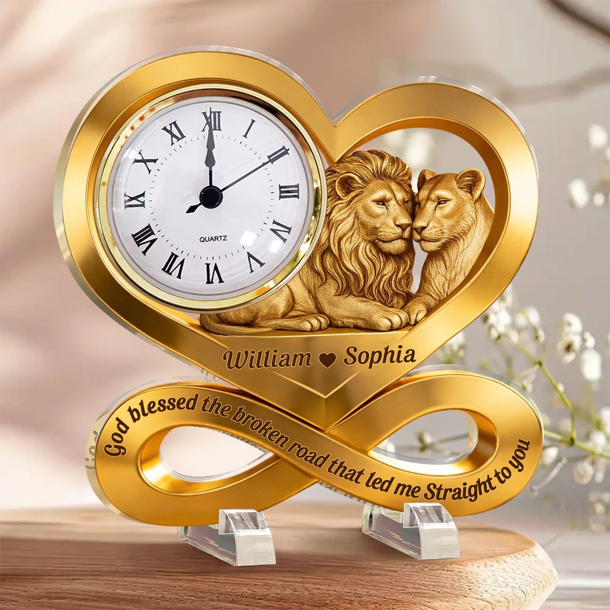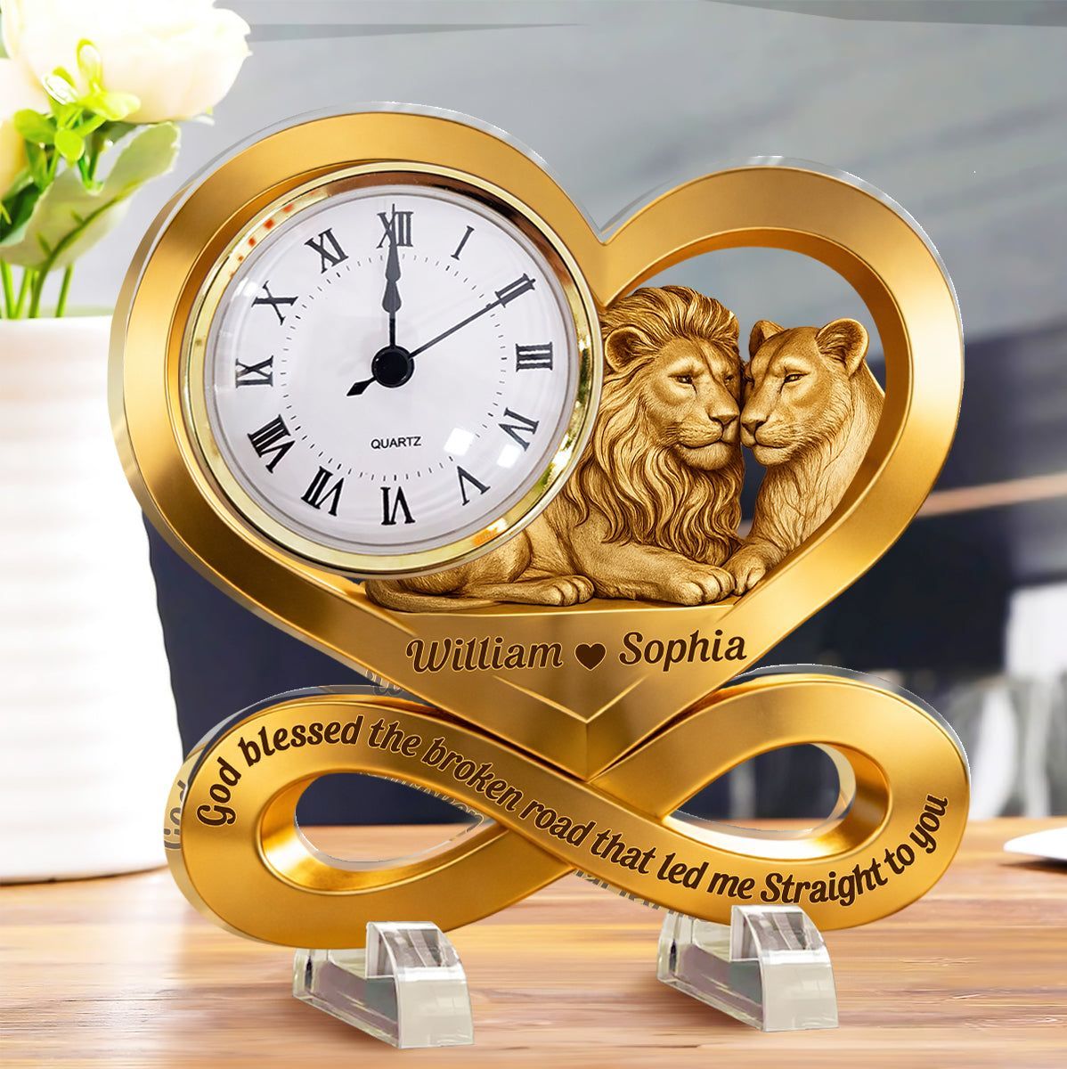 Personal isierte Löwe Paar Infinity Acryl Schreibtisch uhr | Custom Geschenk für zeitlose Liebe
